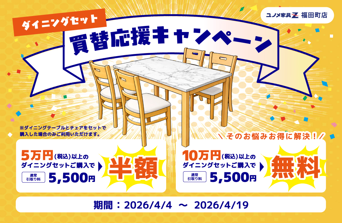 【凄いSALE限定】 ダイニングセットの買い替え、今がチャンス! 古い家具の処分にお悩みの方も、この機会にスッキリ解決! ダイニングセットご購入で… ▶ 税込50,000円以上 → 引取処分料【半額】…