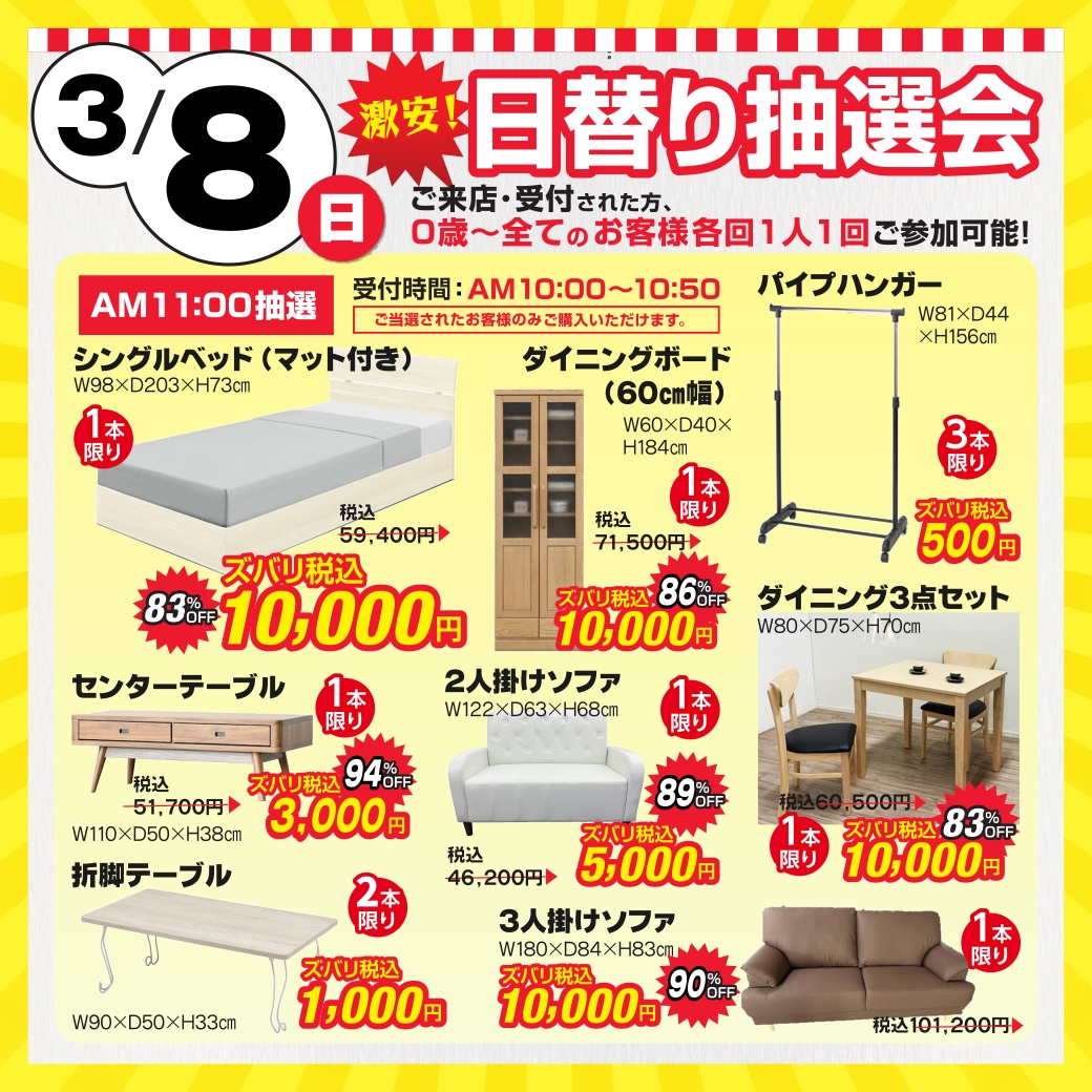 今週末 3月8日(日)、ユノメ家具Z福田町店にて、毎回大熱狂の「日替り抽選会」をいよいよ開催いたします!
