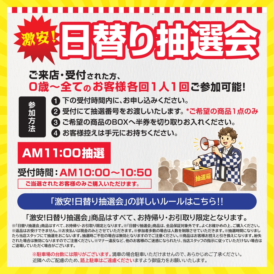 | 開催時間 | AM11時抽選(受付時間AM10時~) |