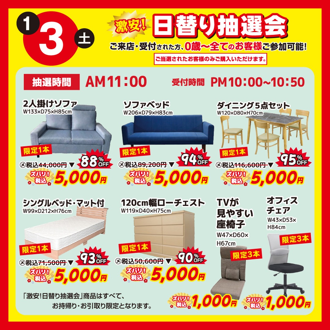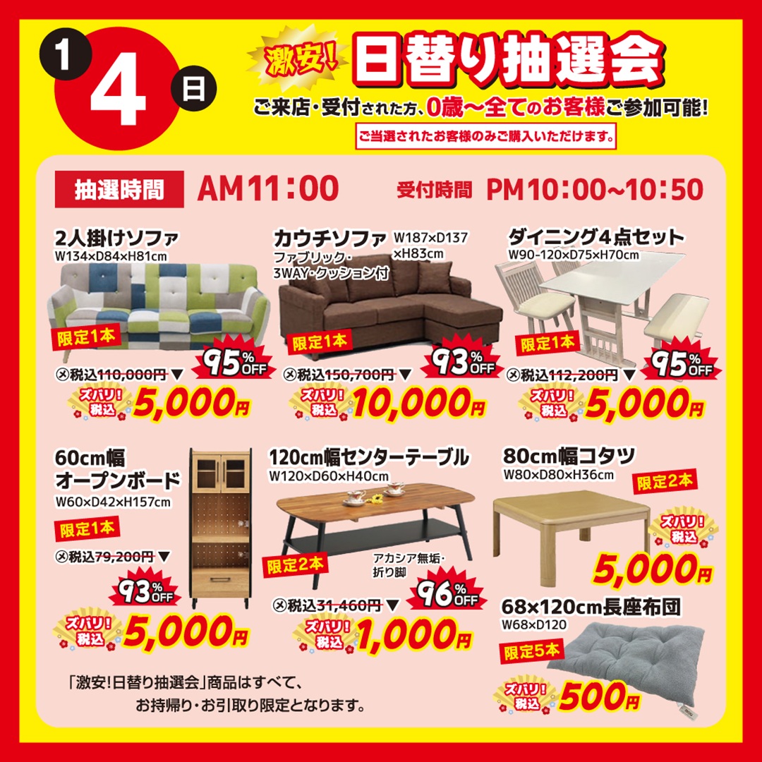 ⑤ 1月3日(土)・4日(日)開催|激安‼ 日替り抽選会